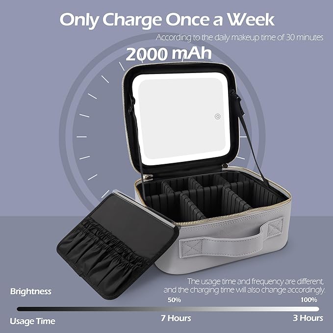 MOMIRA Travel Makeup Bag Cosmetic Bag Makeup Organizer Bag with Lighted Mirror, Adjustable Brightness in 3 Color Scenarios, Waterproof Makeup Train Case, Gift for Women - Grayish