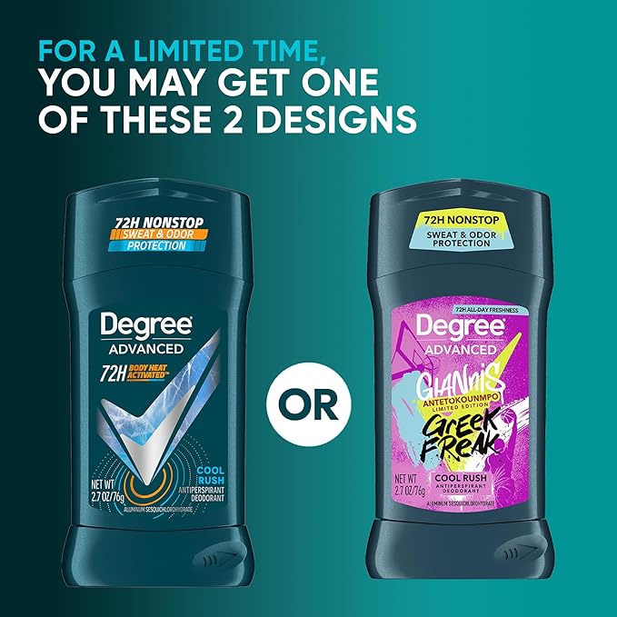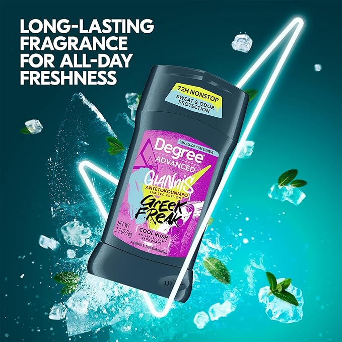 - DEGREE DEODORANT FOR MEN: Stock up on the Limited Edition Giannis Antetokounmo “Greek Freak” deodorant antiperspirant for 72 hours of nonstop sweat and odor protection on and off the court.