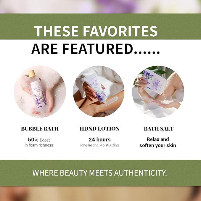 - Romantic lavender: Bathe in our lavender spa set and enjoy the sweet floral lavender scent. The spa bath kit will bring you the desired relaxation.