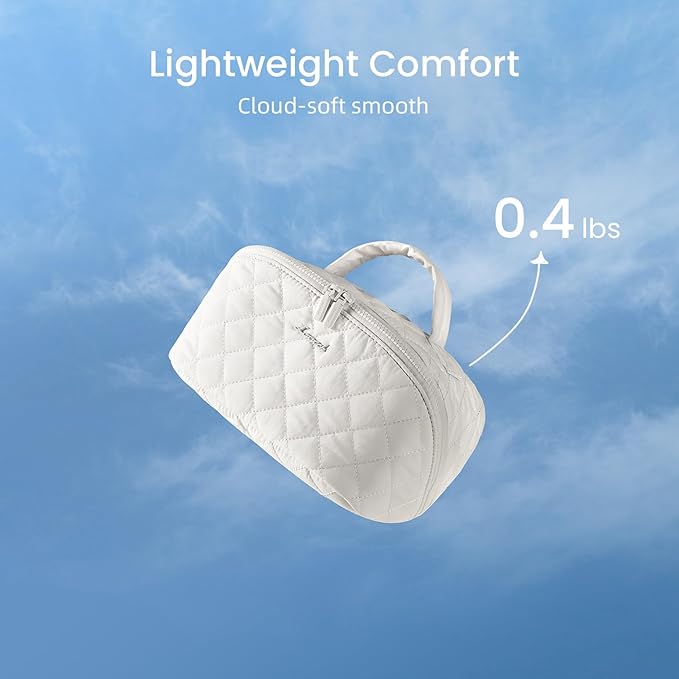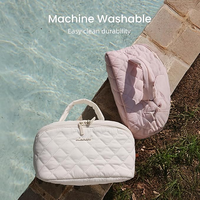 - Puffy&Machine-Washable Fabric: Crafted from waterproof cloud-soft puffer material, this cosmetic travel bag combines durability with style. The crush-resistant padding protects fragile items, while the machine-washable fabric ensures effortless cleaning. Lightweight yet structured, it stands upright on countertops.