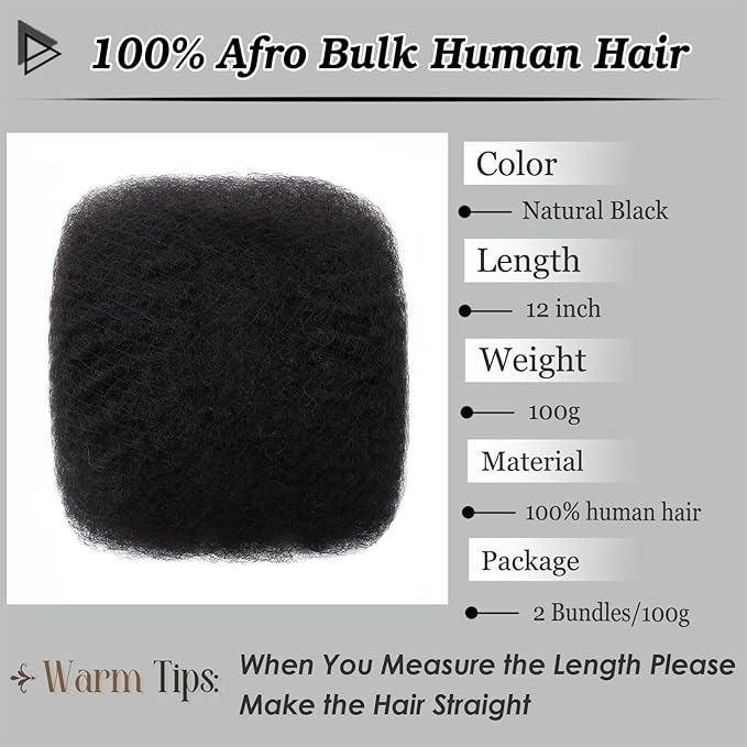 - 【100% Afro Bulk Human Hair】 Made from 100% Real human hair, this Afro Kinky bulk hair is soft, durable, soft to the touch, light, full, looks natural and long-lasting. It can be treated just like your natural hair, allowing you to dye and braid it with heat tools for a personalized look. No tangles, no shedding, no chemical smell and will not cause skin itching and allergies.