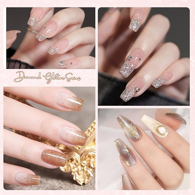 - Glitter Finish: This set features a stunning array of glitter gel polishes, perfect for adding sparkle and shine to your nails, making them stand out for any occasion
