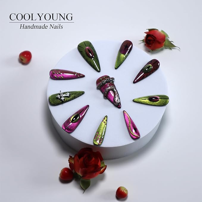 Handmade Nails, Green Press On Nails, Thick Press On Nails, Snake Nails, Press On Nails Stiletto, Press On Nails Cat Eye, Luxury Press On Nails, Women Gifts, COOLYOUNG Nails, 10 PCS, Size S