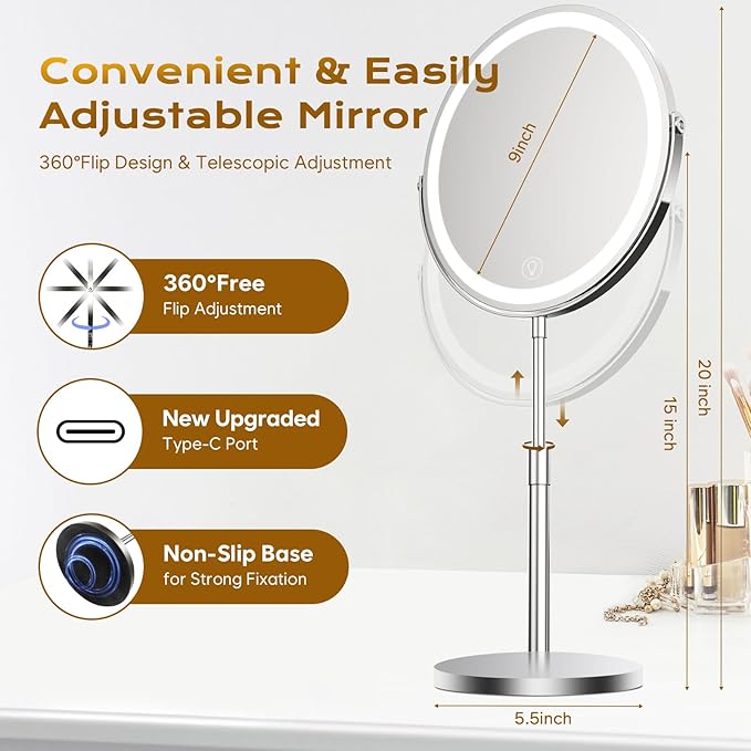 - 【360° Design & 15” Adjustable Height】360° swivel mechanism enables effortless angle adjustments, providing the perfect viewing position for makeup application, hairstyling, and skincare routines. Height adjustability of ensures comfortable use, adapting to vanity tables, bathroom countertops, and office desks. The stable, non-slip base keeps the mirror secure on any surface, preventing accidental tipping.