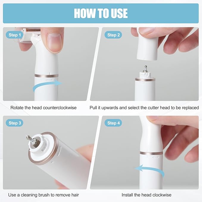 - Easy to Use: Rotate the head counterclockwise, Pull it upwards and select head to be replaced, Use a cleaning brush to remove hair, Install the head clockwise, gently glide, without pulling, and done