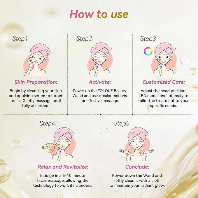 - 7-in-1 Skincare Wand: Red Light (650~680nm), Green Light (540~560nm),Blue Light (430~450nm),Orange Light (590~610nm),Purple Light (380~420nm),Greenish Light (460nm-490nm),Light Green Light (380-680nm).These 7 colors of light are tailored to suit different skin types, providing versatile skincare solutions.