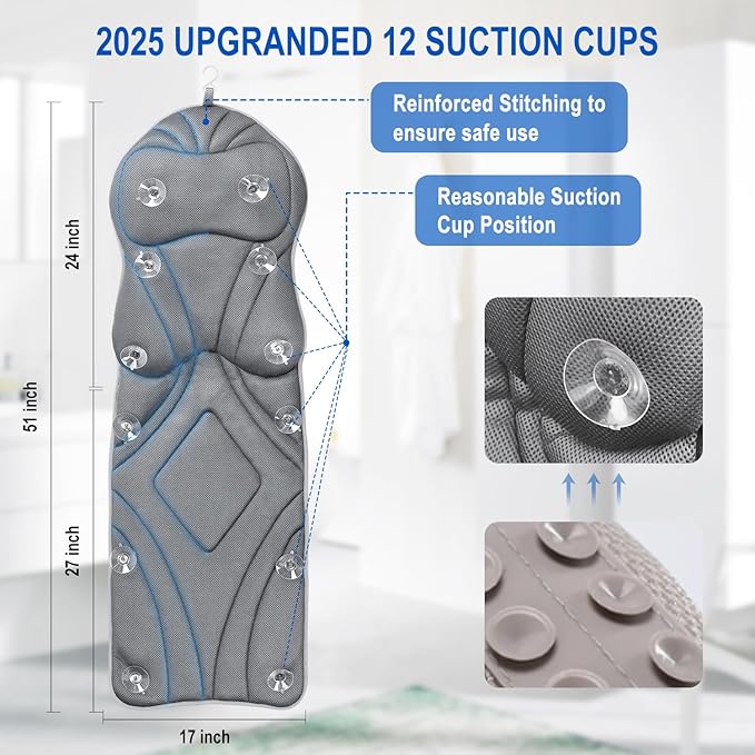 - 【Secure and Slip-Resistant】: Say goodbye to frustrating slipping issues! Our bath pillow luxury features 12 powerful anti-slip suction cups that securely grip any smooth bathtub surface, ensuring a stable and worry-free bathing experience.