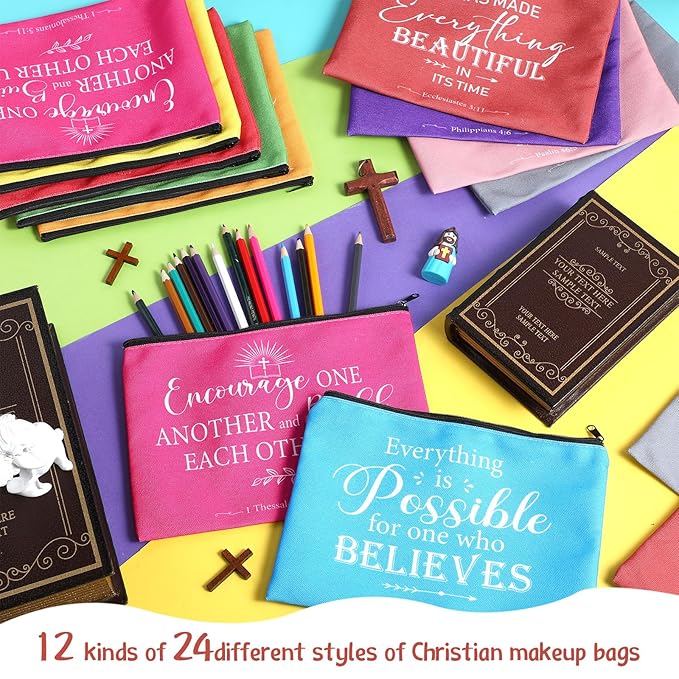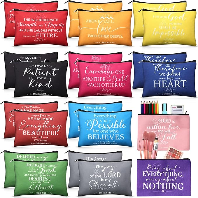 24 Pcs Christian Makeup Bag Bible Cosmetic Bags Inspirational Bible Verse Toiletry Pouches Canvas Motivational Pouches with Zipper for Women Organize Cosmetics Toiletries Stationery(Colorful)