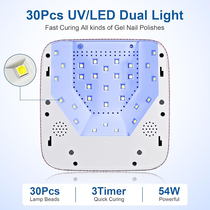 - 【Smart Auto Infrared Sensor】The uv nail lamp features intelligent infrared sensor function,hand in, light on, hand out, light off,fully automated curing process frees up your hands and offers you a new salon nail experience. With 30 lamp beads and a power of 54W, our led nail light for gel nails cures your nails in half the time of other lamps, quickly and evenly drying them.