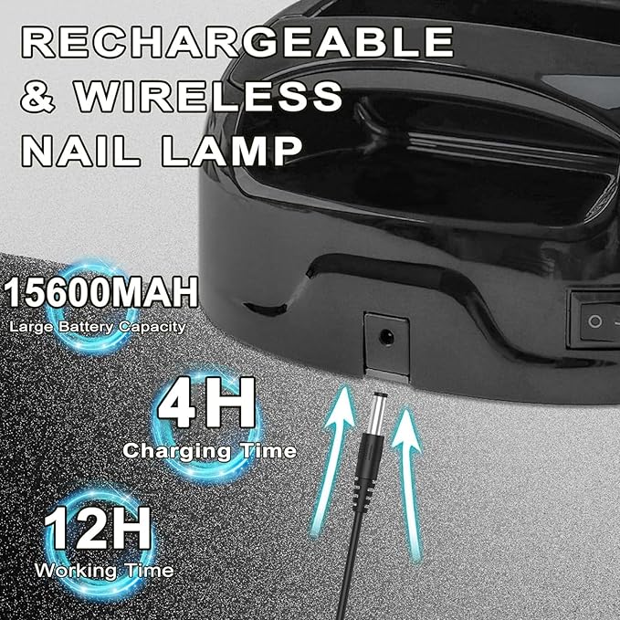 - 【High Power & Fast Drying】96W high power for quick drying, 42pcs LED beads which last up to 12 hours helps to uniformly and efficiently cure gel nail polish. This cordless nail lamp built-in rechargeable lithium battery 15600mAH battery, 12 hours continues working time after 2 hours full charging