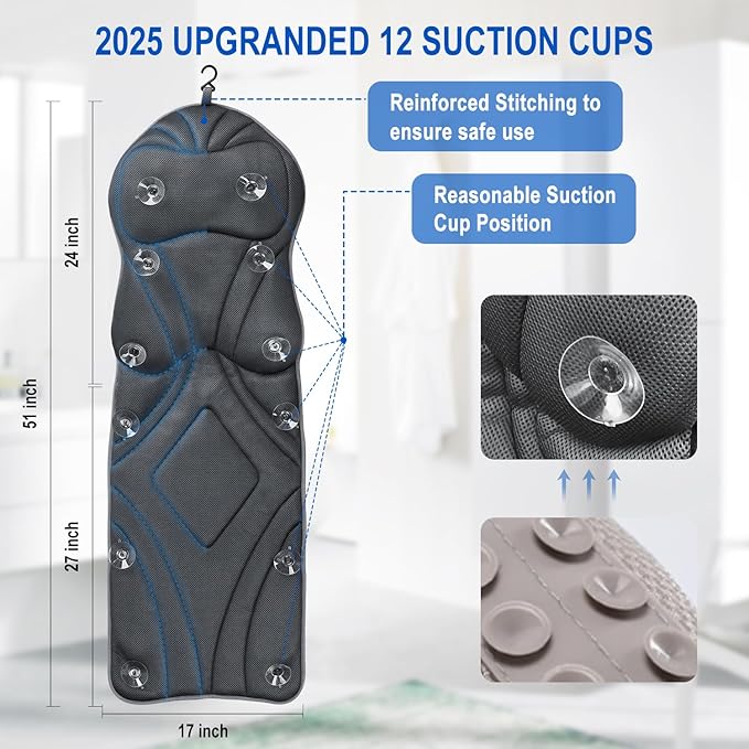 - 【Secure and Slip-Resistant】: Say goodbye to frustrating slipping issues! Our bath pillow luxury features 12 powerful anti-slip suction cups that securely grip any smooth bathtub surface, ensuring a stable and worry-free bathing experience.