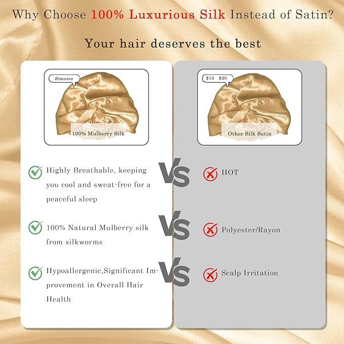 - [Breathable & Hypoallergenic Silk] Made from breathable mulberry silk, this silk sleep bonnet ensures that your scalp stays cool and comfortable throughout the night. The hypoallergenic properties of silk also make the mulberry silk bonnet a great option for those with sensitive skin or allergies, offering both comfort and care