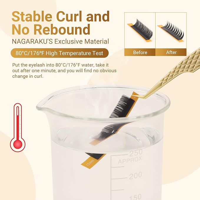 - HANDMADE WITH HIGH QUALITY: Unlike machine-made eyelashes, NAGARAKU's fifth-generation flat eyelashes are 100% handmade with uniform diameter, making individual eyelashes more neatly arranged, denser and more voluminous. 80 ℃°/176 ℉ high temperature rebound resistance test passed, and will not fade or becomes straight