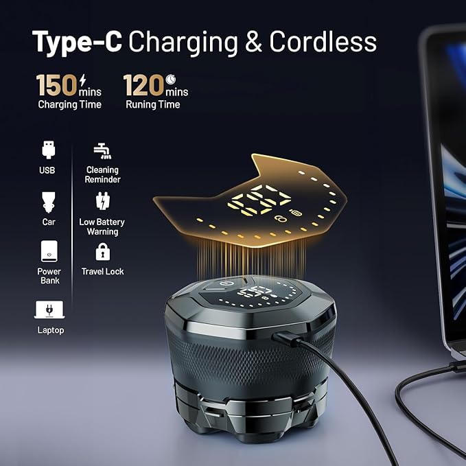 - LED Display & Travel Lock: The men's bald head shaver features an LED display that accurately shows the battery percentage. A long press of the switch button for 3 seconds activates the travel lock, preventing accidental touches and unnecessary power consumption. The electric head shaver provides 120 minutes of cordless use, allowing you to shave anywhere and anytime, outlasting other models