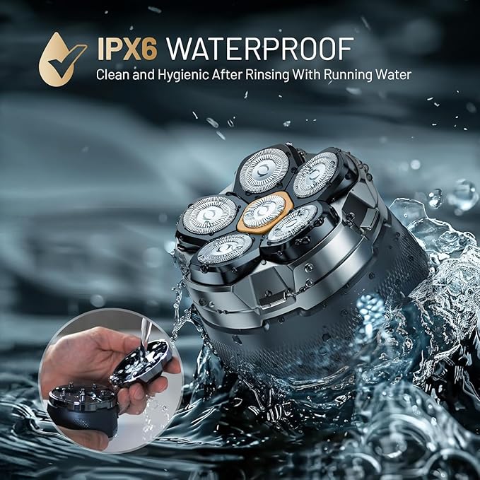 - IPX6 Waterproof & Wet/Dry Use: Our electric head shaver is fully IPX6 waterproof, making it safe to use in the shower and under running water. Enjoy a comfortable dry shave or a refreshing wet shave with shaving foam. The removable and washable head allows for easy cleaning directly under the tap