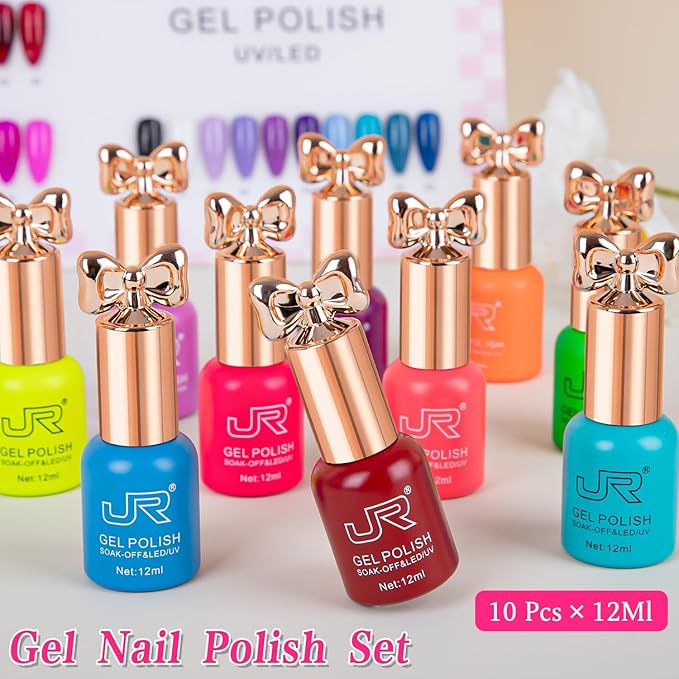 JR Gel Nail Polish 10pcs 0.4oz Neon Gel Nail Polish Set - Vibrant Neon Colors Nail Art Kit for Rave & Summer Festivals, Elegant Bow Bottle Design, Quick Dry & Chip-Resistant Gifts for Women E Model