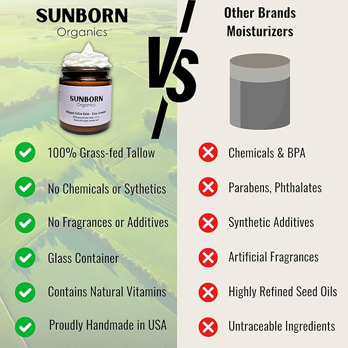 - NATURAL INGREDIENTS: 100% grass-fed beef tallow infused with organic lavender buds and organic beeswax. All your skin and body needs for complete nourishment. Free from added oils, chemicals, fragrances, synthetics, dyes or preservatives.