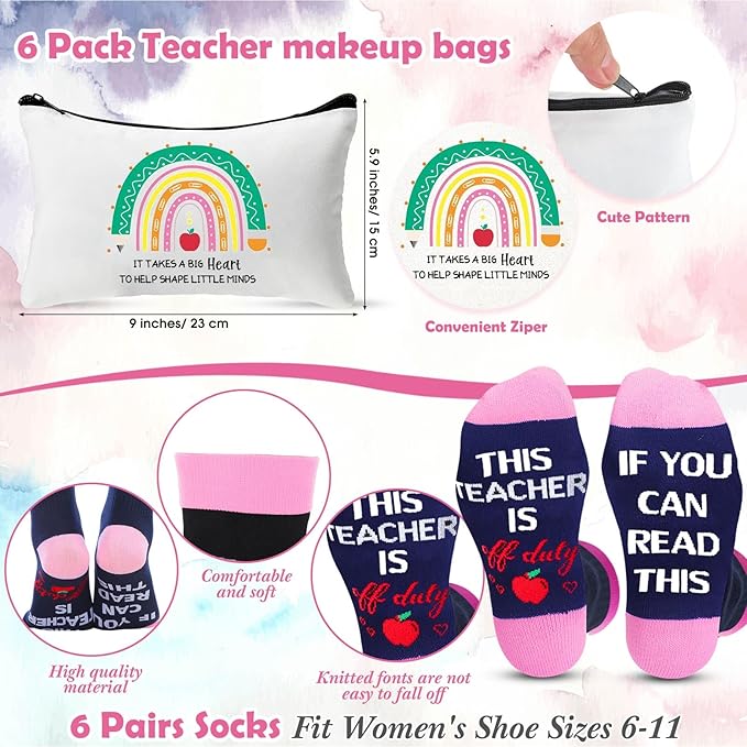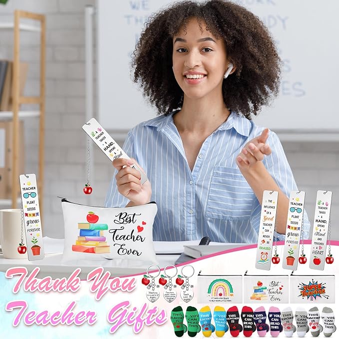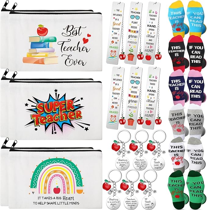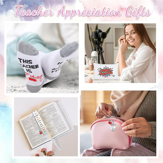 - Teacher Appreciation Gifts Bulk Sets: you will receive 24 set teacher gifts, including 6 pairs teacher socks in 6 colors, 6 pcs thank you teacher cosmetic bags, 6 pcs stainless steel appreciation bookmarks and 6 pcs thank you teacher keychains, which have 3 styles, plentiful and beautifully, an ideal gift set for teachers
