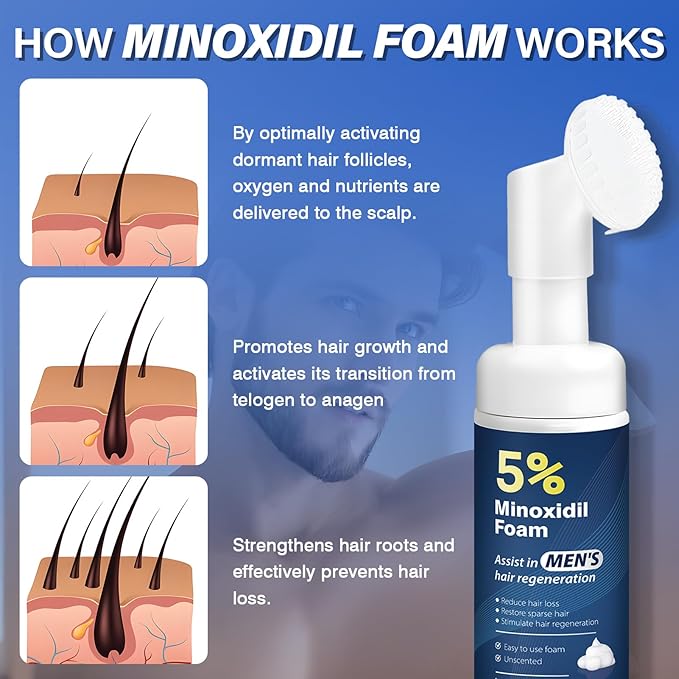 - Give your hair a new lease of life: Apply minoxidil 5 percent foam to the local area where hair growth is needed, and let the minoxil activate the hair that is not actively growing and prompt them to enter the growth phase. Minoxidil foam for men provides nutrition and nourishment to the scalp and hair, supporting healthy hair growth. When new hair begins to appear, some old hair may fall out. Don't worry, this is a normal phenomenon of minoxidl working