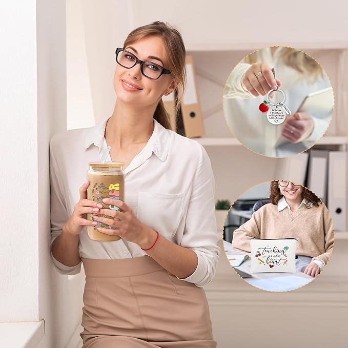 - 12 PCS Teacher Appreciation Gift Set:The package contains 4 Glass Cup,4 different styles of cosmetic bags, 4 Keychain,sufficient quantity and rich style to meet your matching needs