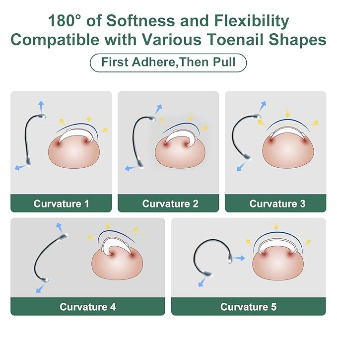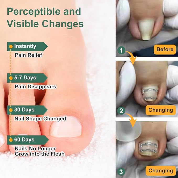 - Fast Pain Relief and Ongoing Correction: Many users feel immediate pain relief with the nitinol ingrown toenail corrector strips. The ingrown toenail kit delivers a steady rebound force, and the pain often disappears within 5 to 7 days. Within 30 days, your toenail shape begins to change, and by 60 days, the nail typically stops growing into the skin. Your curved nail is straightening.This curved toenail corrector is a simple yet effective solution