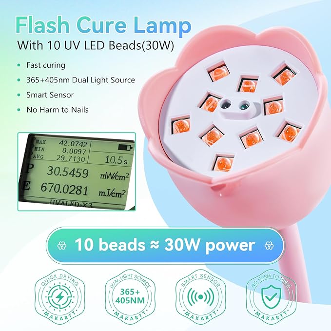 - Quick Drying & Efficiency: Makartt pink cordless nail lamp features a 1800mAh rechargeable built-in battery and 10 UV+LED dual light source beads, effectively shortening curing time and curing all types of manicure gels in just 60 seconds (keep within 5cm). Different nail gels have different curing times, such as false nails (10s), gel polish nails (60s), extension gel nails (120s), and nail rhinestone glue (60s).