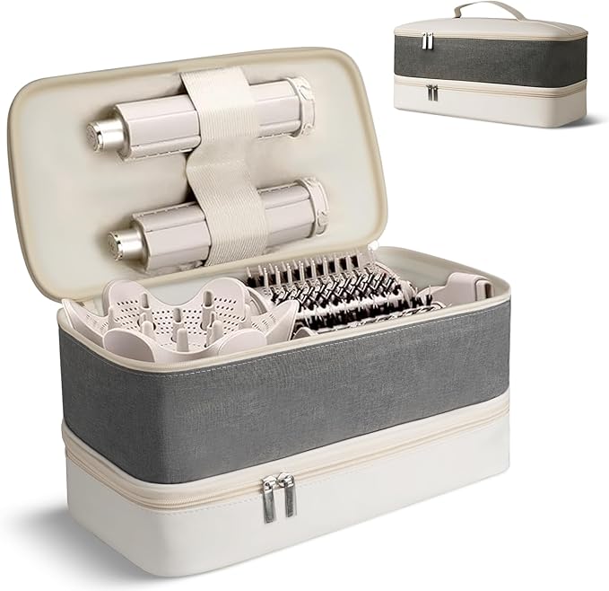 - LARGE CAPACITY: This hairdryer travel case features a dual-layer large capacity design that perfectly separates the hairdryer body from its accessories, preventing scratches. The double zipper allows for bidirectional opening, facilitating quick and easy storage. It can accommodate large attachments, such as the Shark Curl Defining Diffuser. The hair dryer organizer includes elastic fixed straps to fasten the devices, making the hair dryer storage case layout more organized.Dimensions: 14in L * 7in W * 6.6in H.