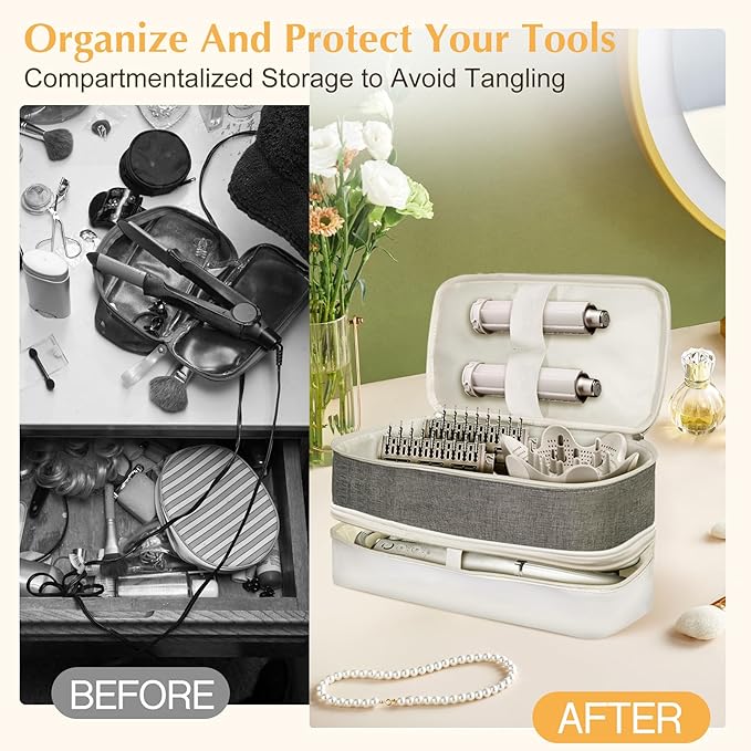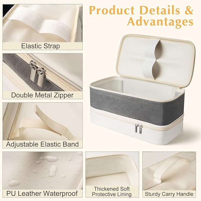 - SUPERIOR QUALITY: This travel carrying case for hair dryer is made of premium fabrics and PU leather. The combination of high-end gray fabric and beige leather adds elegance and fashion charm to this double-layer hair dryer storage case. The inner layer is soft in texture, which can safeguards your devices from scratches and bumps during travel. The outer layer is scratch resistant, dust-proof, and waterproof, providing comprehensive protection for your hair dryer.