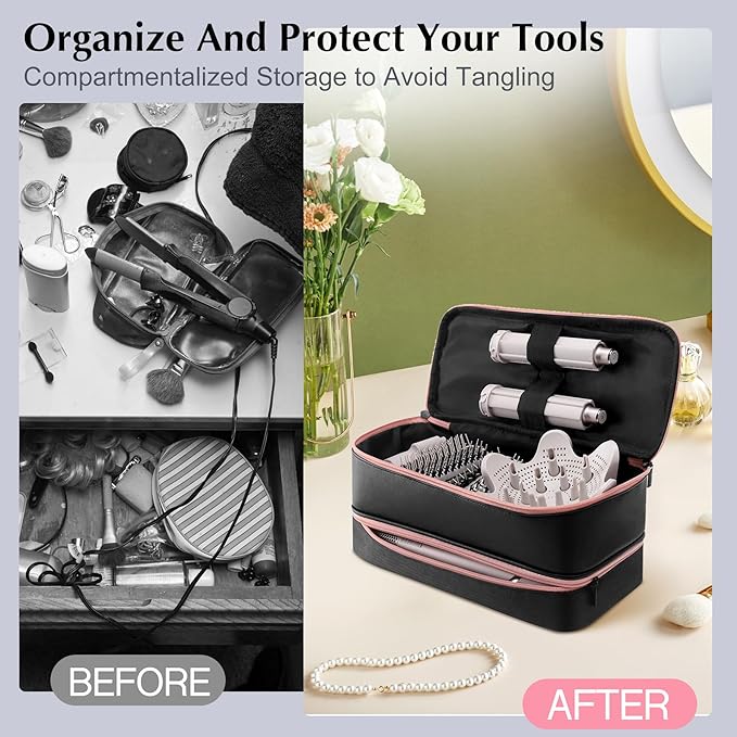 - LARGE CAPACITY: This hairdryer travel case features a dual-layer large capacity design that perfectly separates the hairdryer body from its accessories, preventing scratches. The double zipper allows for bidirectional opening, facilitating quick and easy storage. It can accommodate large attachments, such as the Shark Curl Defining Diffuser. The hair dryer organizer includes elastic fixed straps to fasten the devices, making the hair dryer storage case layout more organized.Dimensions: 14in L * 7in W * 6.6in H.
