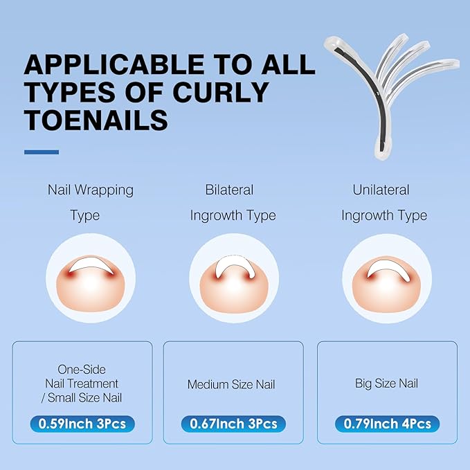 - 【VERSATILE AND RELIABLE】Our ingrown toenail corrector comes in 10 pieces with multiple sizes (0.59/0.67/0.79 inches) tailored for various nail sizes, effectively addressing both unilateral and bilateral ingrown toenails for maximum support and contact