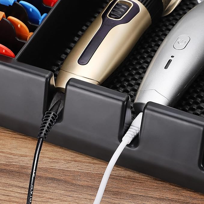 - 【Everything is Easily Accessible】-- It's designed with 3 tall slots with notches for cord organization, so that your corded clippers can rest in there without the wires getting tangled or in the way. 3 Compartments that hold clippers, shears, razors, combs, brushes, dusters. 8 Custom sized short slots for blades. (NOTE: If you find the cord cutouts a bit narrow, please kindly twist it a bit to get the cord to go in and out of the slot)
