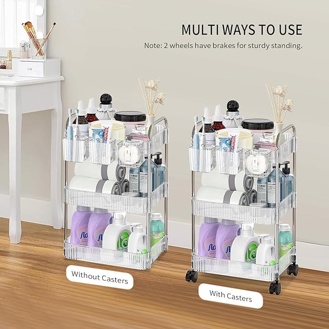 - FLEXIBLE SLIM STORAGE CART: The Bathroom Rolling Utility Cart is equipped with 360° swivel wheels that allow you to move the cart to any corner of the house to store your items. You can use it flexibly for storage in offices, bathrooms, laundry rooms, kitchens, cramped places and more
