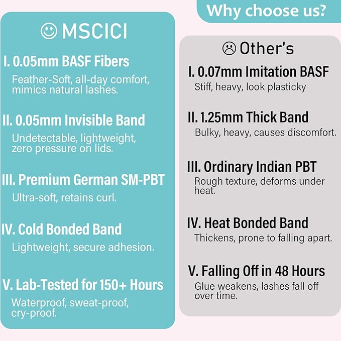 • Why pay more for less? Ditch overpriced brands, try MSCICI! We cut the fluff not the quality. By selling directly to you and reinvesting in R&D (not celebrity ads), we deliver luxury that’s actually worth it. Better 0.05mm lashes, but priced 30% lower