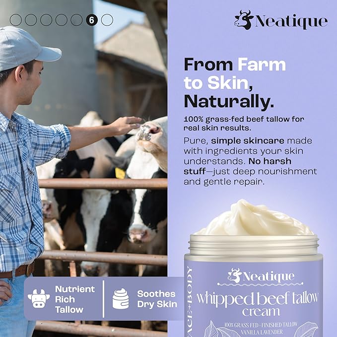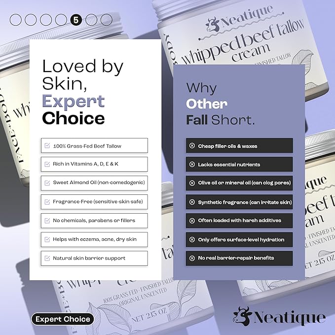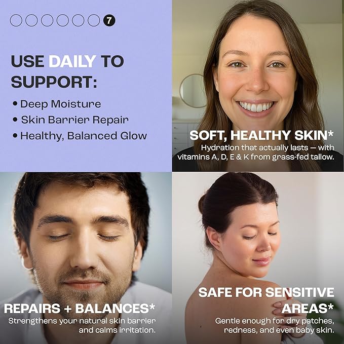 - Pure, Skin-Loving Formula: 100% grass-fed beef tallow deeply nourishes dry, sensitive, or eczema-prone skin. Rich in vitamins A, D, E, and K, it mimics skin’s natural lipids to repair moisture barriers without clogging pores.