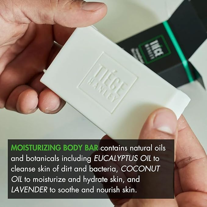- Moisturizing Body Bar and Lip Balm: a high-quality bar soap for men for everyday use in the shower that has a subtle and natural Eucalyptus scent to it. It combines powerful cleansing with rich moisturization to wash away dirt and bacteria yet retain the soft, smooth quality of your skin. LIP is a hydrating lip balm for men appropriate for all climates and conditions. The high-quality ingredients create a protective barrier against wind, dry air, and many other elements.