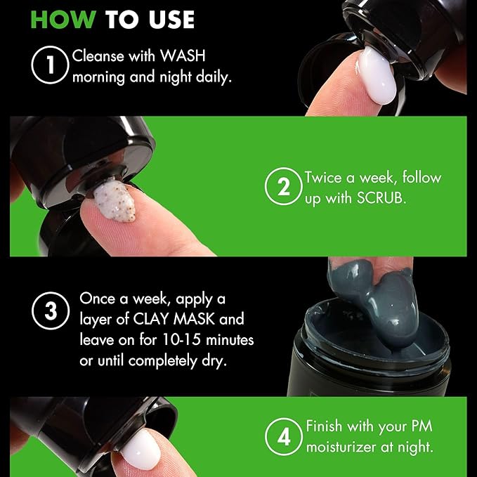 - Face Wash & Exfoliating Scrub: WASH rinses away oil and dirt, is safe for sensitive skin, and helps keep oil production under control. Subtle eucalyptus and cucumber scent leaves skin feeling clean and refreshed. SCRUB is a facial exfoliant that helps clear pores of dirt while promoting new skin cell growth. Using an exfoliant twice a week helps make your skin glow and appear healthy by buffing away and removing dead skin cells.