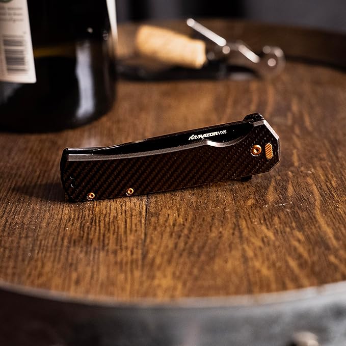 - PREMIUM MATERIALS & CONSTRUCTION - The VX5 black handle features a stainless steel frame with G10-reinforced carbon fiber scales. The ultra-smooth frictionless ceramic ball-bearing pivot deliver fast and easy one-handed opening. The razor-sharp 3” replaceable blades are Japanese 420J2 stainless steel. At 3.5 ounces and 7.3 inches when extended, the VX5 is an ideal everyday carry knife.