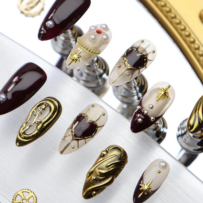 - DESIGN: Our stick on nails are all handmade by experienced and aesthetic nail artists. The press ons have hand-painted swan/floral/polka dots/french tip/snowflake/plaid/bowknot ribbon/holiday tree/blue eye/silver patterns on them, and with 3D flower/mermaid/mushroom designs/rhinestone/pearls trim, glitter and sparkle cat eye/metallic surface, luxury, exquisite and unique