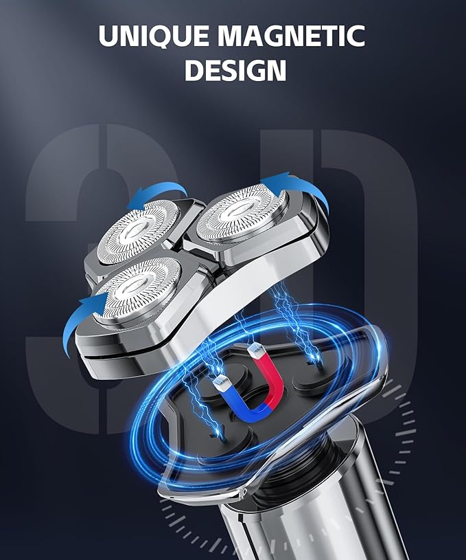 - 3D Floating Shaving Heads for a Smooth, Close Shave:This 3D electric razor for men is designed with three floating shaving heads that adapt to the contours of your face and neck for a close, smooth shave. Blades Spin 12000 Times Per Minute, it ensures a fast, comfortable, and precise shaving experience every time.