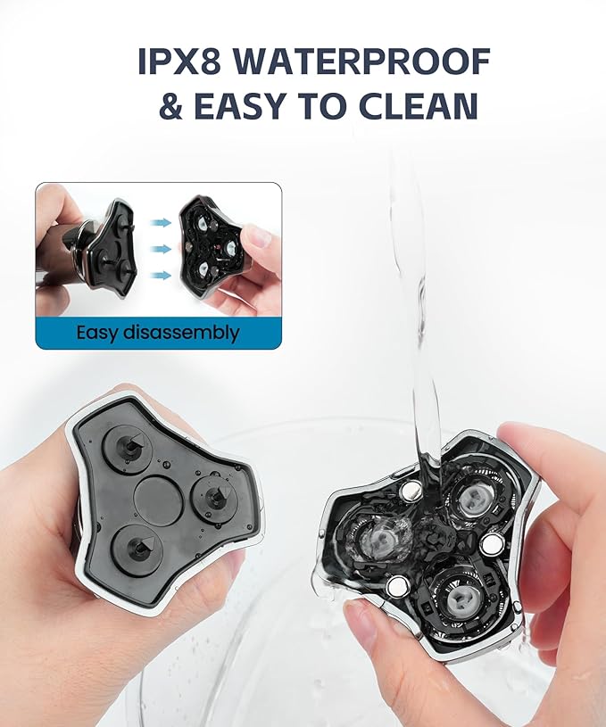 - IPX8 Waterproof for Wet & Dry Use:The shaver is IPX8 waterproof, allowing you to use it with shaving foam, gel, or in the shower. Cleaning is easy—just rinse under running water, ensuring your electric razor for men stays hygienic and ready for your next shave.