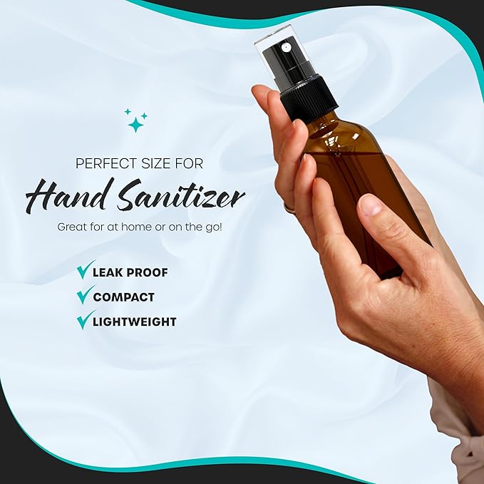 - Premium 4oz Glass Spray Bottles : Our amber glass spray bottles are a great addition to your daily routine! Thick glass construction mean each mini spray bottle is built to last. The amber spray bottles not only look gorgeous but also safeguard contents from UV rays. With precise nozzles, secure seals & a clog-resistant design, our empty spray bottles offer flawless refreshment every time, whether used as a hand sanitizer spray container, cologne spray bottle or travel size spray bottle .