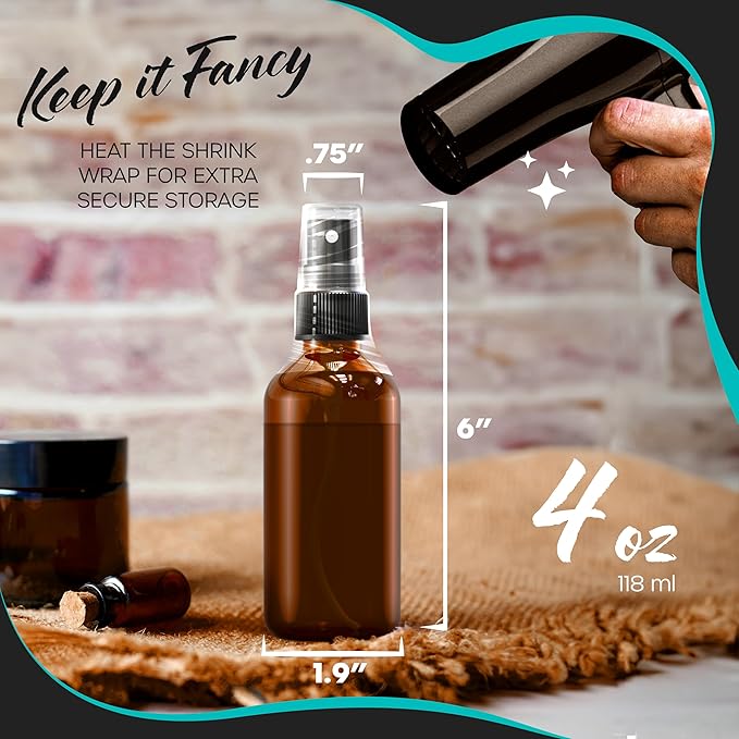- Complete Small Spray Bottles 4 Oz Kit: This empty spray bottle 3 pack has everything you need to spritz! Refilling the spray bottles small capacity is simple with the rigid funnel. Plus, shrink wrap pieces make this amber glass spray bottle set great for gifting as glass spray bottles for essential oils , alcohol spray misters or body spray bottle small containers.