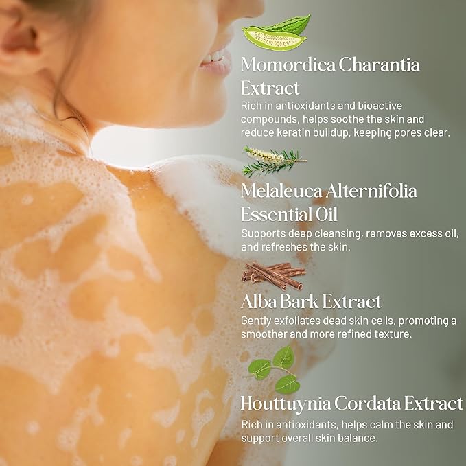 - Targeted Care for Blemish-Prone Skin: This gentle formula, infused with wild bitter melon, provides a refreshing cleanse for areas prone to folliculitis and body acne. With regular use, it helps maintain smoother, clearer-looking skin.
