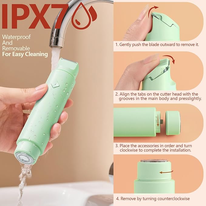 - 【IPX7 Waterproof Easy-to-Use & Cleaning】Experience IPX7 waterproof electric shaver for women both waterproof for Wet/Dry Use, Removable blades and washable trimmer heads, come with a cleaning brush make cleaning easier!
