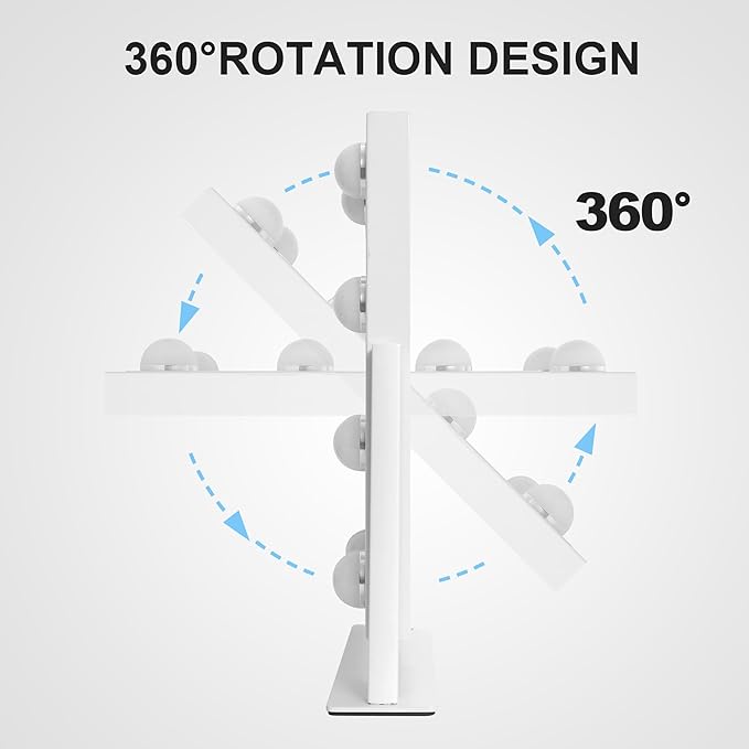 - 360° Free Rotation Desk Mirror: Our lighted makeup mirror can achieve 360° free rotation and can be fixed in any position as needed. The 12-inch high x 10-inch wide makeup mirror with lights allows you to see your entire face at once, helping you to put on delicate makeup