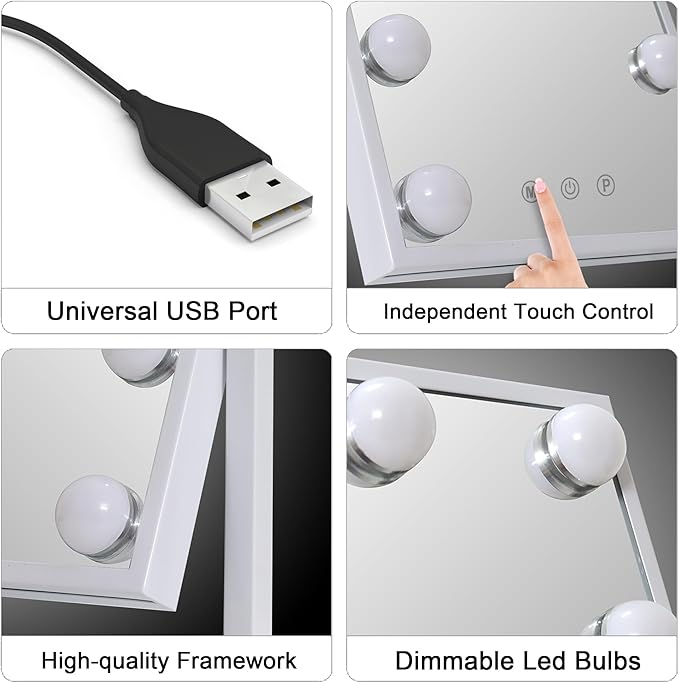 - Intelligent Touch Control and Memory Function: The buttons on the makeup mirror with lights are super sensitive and durable. Just touch the buttons on the lighted makeup mirror with lights screen to turn on/off the desk mirror's light or change the color mode, button M adjusts the light mode and button P adjusts the brightness. The memory function returns the vanity mirror with lights to the brightness it was at before it was turned off
