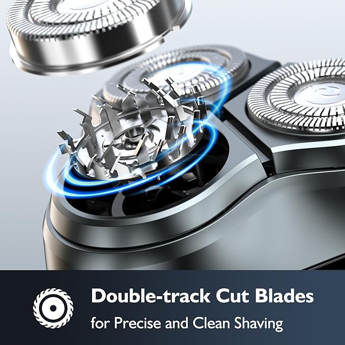 - Efficient & Precise Shaving:This electric razor features a 0.09mm precision shaving mesh that ensures an ultra-close shave, capturing even the shortest whiskers for a flawless result. With 3 dual-track heads spinning at 6000+ RPM, this electric shaver minimizes skin irritation and delivers a smooth, comfortable grooming experience every time.